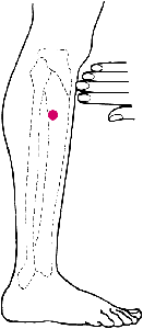 | Où est donc ce point ? Ce point est un peu plus difficile à déterminer que la plupart de ceux déjà rencontrés. De bas en haut, il est situé à cinq travers de doigts au dessous de la pointe de la rotule. D'autre part, dans le sens de la profondeur, il est situé à mi-chemin entre les crêtes des deux os, le tibias sur l'avant et le péroné sur l'arrière. |