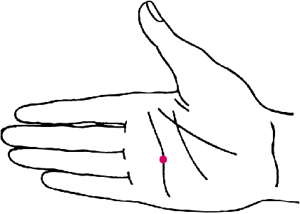 | Le second point est dans la paume de la main. Pour le trouver, c'est très simple, il suffit de replier l'annulaire sur la ligne de tête. Le bout du doigt indique alors le point. |