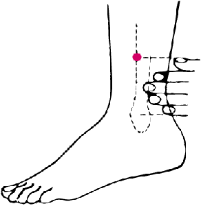 dans un petit creux sensible, sur le devant du péroné. Pour le trouver, appliquez le petit doigt sur la partie saillante de l'os de la cheville, appliquez les doigts de la main à la suite les uns des autres sur le péroné, le pouce est alors positionné exactement sur l'endroit à masser. Il s'agir là encore d'un point bilatéral, masser les deux côtés, jambes droites et gauche. |