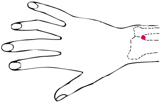 | Le premier point est situé sur le dos du poignet. Mesurez trois travers de doigt à partir du plis de flexion du poignet, et positionnez vous dans l'angle formé par les deux os. C'est là. |