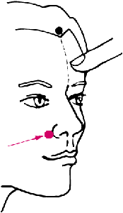 la ligne du milieu, un peu en arrière de l'origine des cheveux. Pour le repérer, avec le doigt prolongez l'arrête du nez vers le haut, vous passez sur une petite bosse et tout de suite derrière, vous trouvez un petit creux, c'est là qu'il faut appuyer et masser vigoureusement. A côté de ce point essentiel, il existe des points accessoires mais très utiles comme le point des narines situé à leur base. Points à masser en fonction de la narine bouchée. |