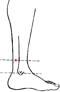 | Ce point se situe encore une fois au niveau du pied. Il est situé à l'intérieur de la jambe, le long du bord arrière du tibias et à cinq travers de doigt de la saillie de la cheville, très précisément dans le petit creux de l'os que l'on sent à ce niveau. |